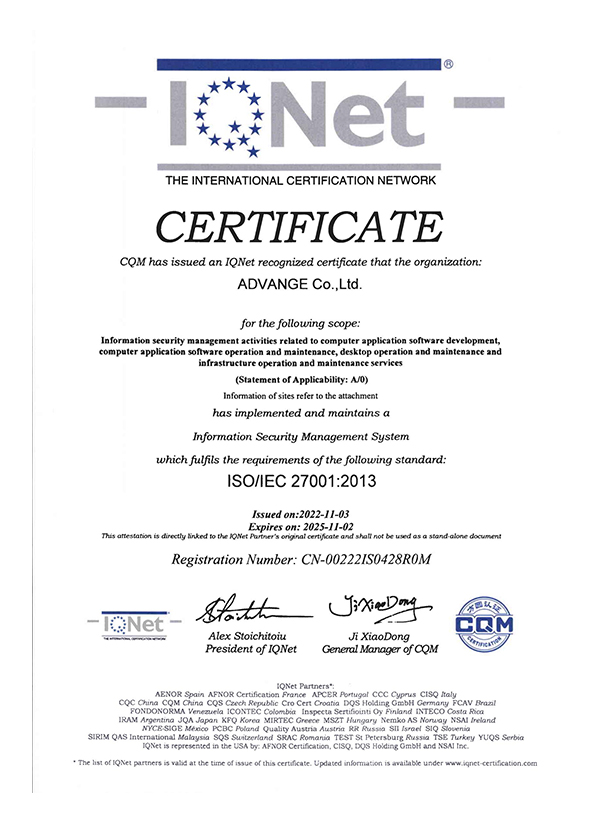 具备ISO9001、20000、27001、等质量与安全管理体系的应用实施,拥有符合国际标准的安全与质量管控体系,确保了服务的品质与安全